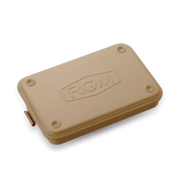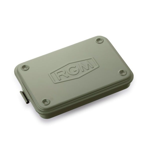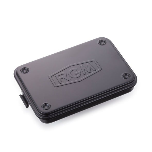 スチールの一枚板をプレス一体型加工した本体とフタの接合に蝶番を使用しない丈夫な構造のツールボックス。フタにはRGMの刻印を施し、四隅の凹凸がスタッキング収納を可能に。