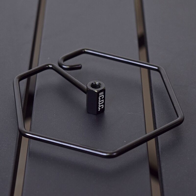 ※アルミニウム製により重いものを吊り下げると癖がつく、折れるなどの事象が発生する場合がございます。 中央部に上下2ヶ所1/4メスネジを採用しているので1/4オスネジを使用している物をさらに連結させたりDリングを継続し持ち手を作ったりすることが可能。 トングやシェラカップを掛けることはもちろん、LEDランタンを下げてランタンスタンドとしても活用できます。