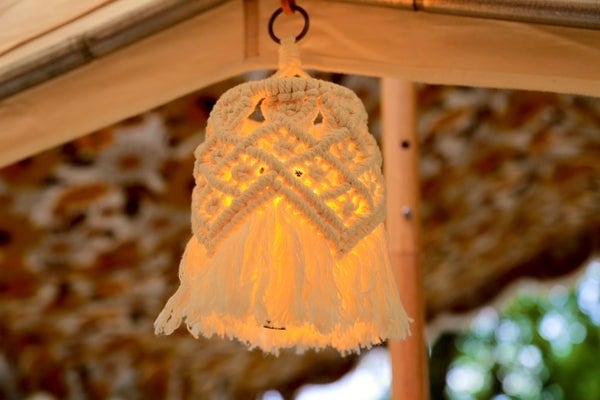 キャンプシーンに飾れば、空間の雰囲気を華やかに演出するマクラメ編みランタンシェード。