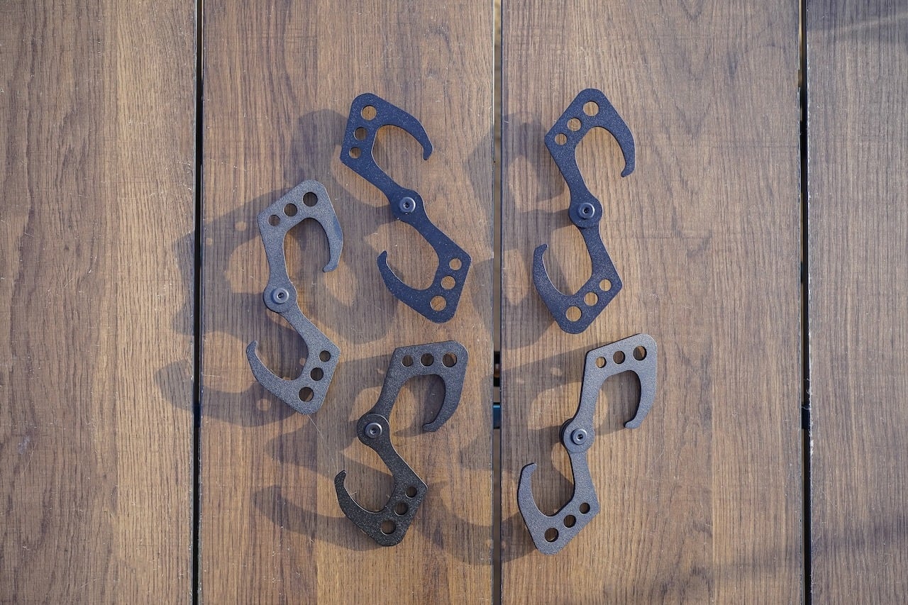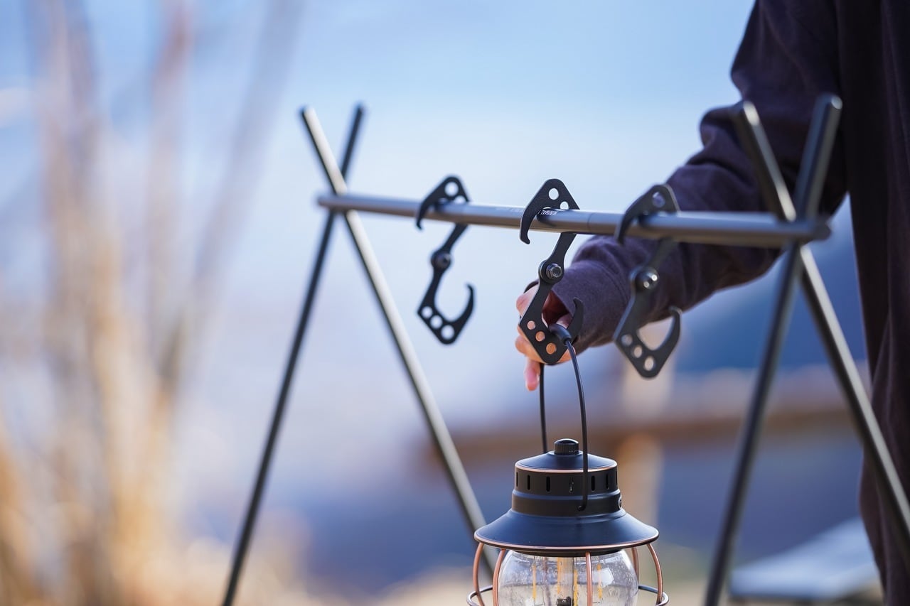 アルミ製なので軽量で折りたためば小さくなりポケットに入る手の平サイズで簡単に開いて引っかけれます。